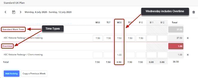 Time Types can be useful for organising the Timesheet into different sections. For example, if you wanted to record when employees work more than their standard hours you could create a 'Standard Work' and 'Overtime' Time type. Employees can then enter their standard hours in one section and any overtime in a separate section (as in the screenshot below).