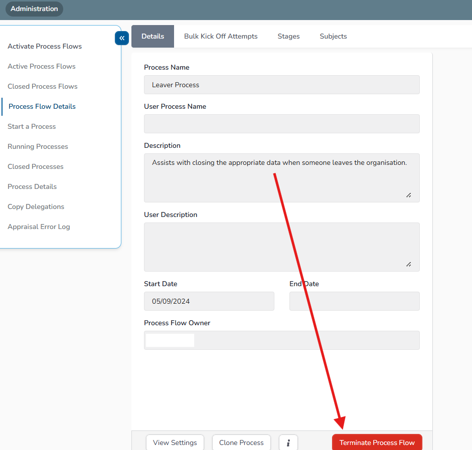 Administration >> Processes >> Active Process Flows >> Find the leaver process flow >> Terminate process flow: