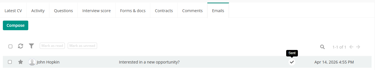 After an email has been sent through Cezanne Recruitment, you can view the delivery status from the Emails tab on a Candidate page, or the sent folder from the Inbox feature.