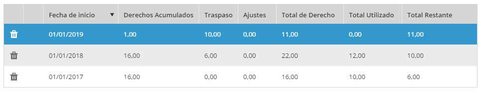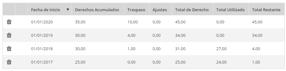 - El empleado recibe sus 25 días de Derecho Acumulado estándar, más los 5 días traspasados del año 2017. Por lo tanto, reciben un Total de Derecho de 30 días.