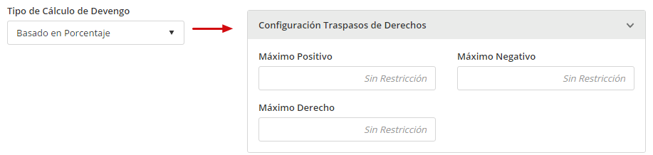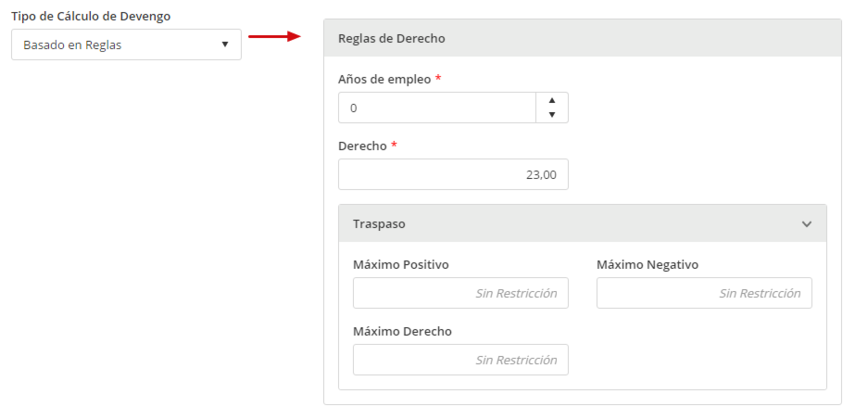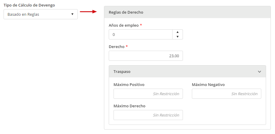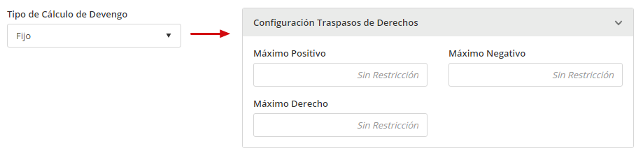 | Máximo Derecho | Utiliza este campo para establecer un total de máximo derecho (derecho acumulado + traspaso + ajustes) que un empleado puede recibir para un año de devengo. Si no quieres restringir el máximo derecho, deja este campo como “Sin Restricciones”. |