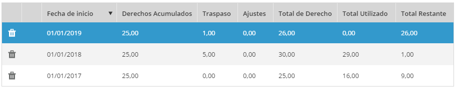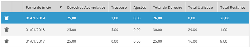- El empleado recibe sus 25 días de Derecho Acumulado estándar, más el día traspasado del año 2018. Por lo tanto, reciben un Total de Derecho de 26 días.