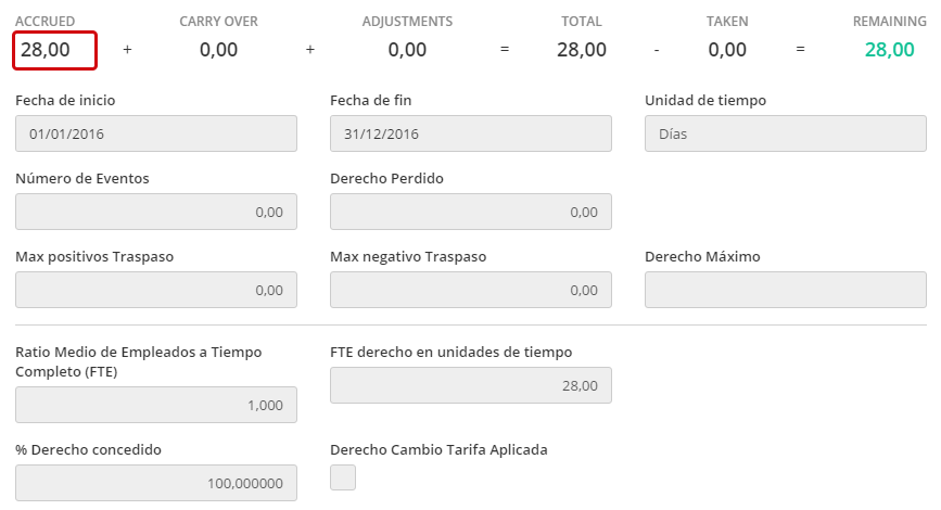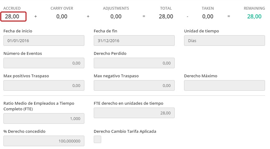- Aunque un empleado es inscrito para 67.12% del periodo de devengo 2014 (245 de 365 días), aun recibirán el derecho pleno de 28 días para el primer periodo de devengo trabajado.