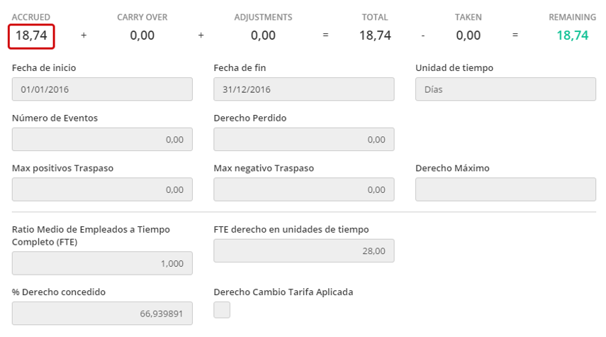 - Derecho de Devengo = 66.93% de 28 días = 18.74 días pro rata.