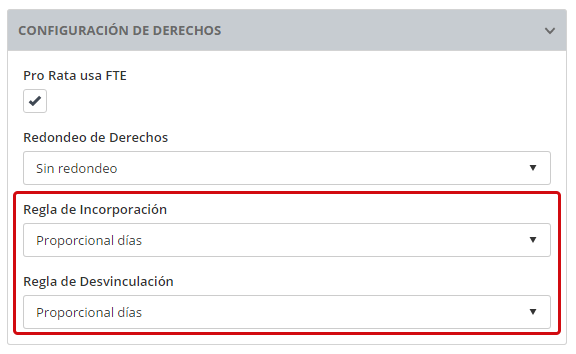 Por ejemplo, si un plan de ausencia Anual tiene una Regla de Incorporación de ‘Derecho Pleno’ y una Regla de Desvinculación de ‘Proporcional a Días Calendario’, y un empleado entra y sale en el mismo año de devengo, el derecho acumulado será calculado usando la regla de ‘Proporcional a Días Calendario’.