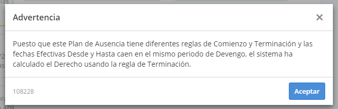 Si un plan de ausencia tiene diferentes reglas de Incorporación y Desvinculación, y las fechas de Efectivo Desde y Efectivo Hasta caen en el mismo periodo de devengo (Anual, Mensual o Semi-Mensual), recibirás la siguiente advertencia para informarte que la regla de Desvinculación ha tomado prioridad.