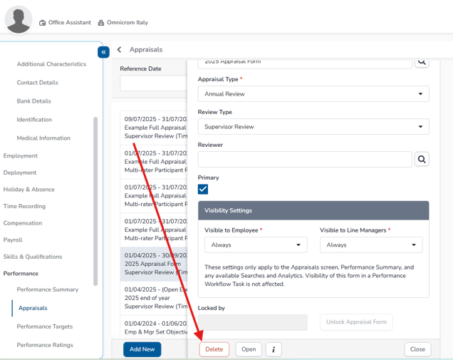 If you have assigned an appraisal to an employee, either through a performance review, import or manually adding it, you can delete it by clicking the delete option on the appraisal: