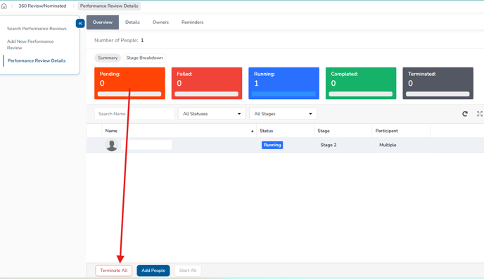 You can only delete an appraisal if there is no ongoing process for that appraisal. If the processes for this appraisal have not yet been terminated, you will need to click 'terminate all' on the performance review: