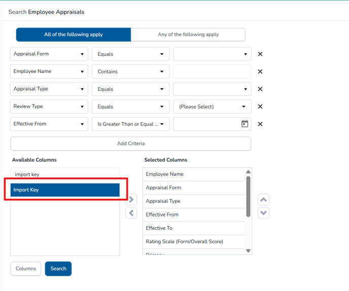 The import will require some specific information, such as the: import key, person code, effective from date, appraisal form name, appraisal type and review type. You can get this information by going to