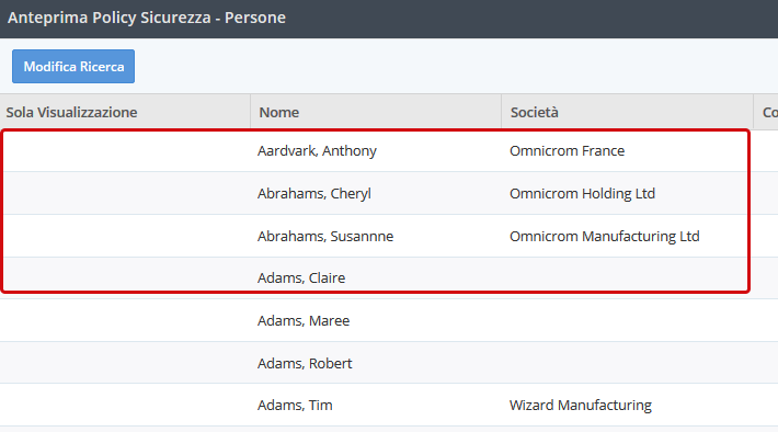 | Consenti Solo Visualizzazione | Darà all'utente la possibilità di visualizzare, ma non di modificare, aggiungere o cancellare i dati delle persone nella policy. |