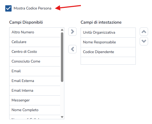 - Scegliere se Visualizzare il codice persona dalla schermata di configurazione Intestazione persona (Amministrazione >> Impostazioni azienda >> Intestazione persona).