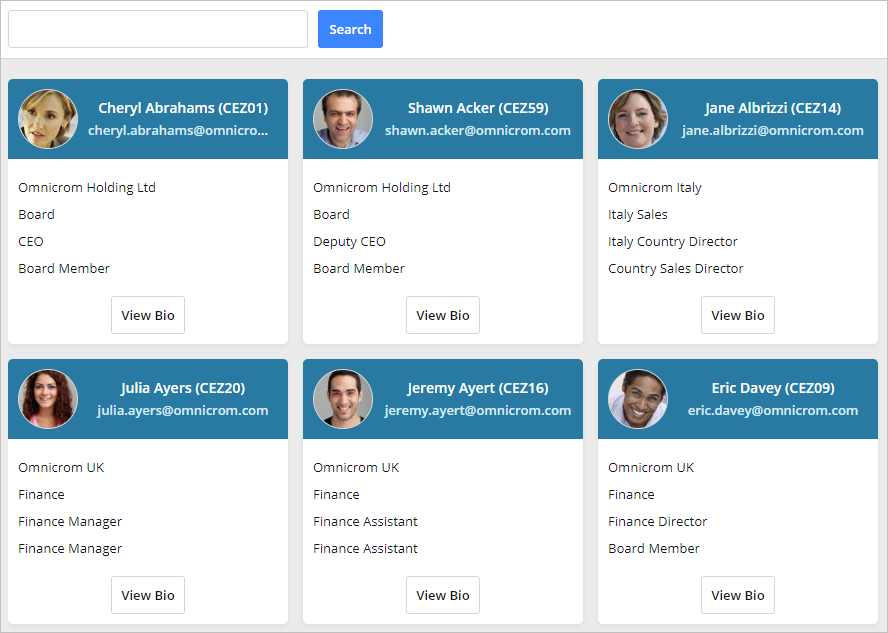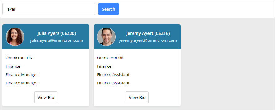 The information shown on the Contacts List is configurable by HR Professionals. It is possible to change the fields that appear on the Contacts List cards and which of the fields will be searched on.