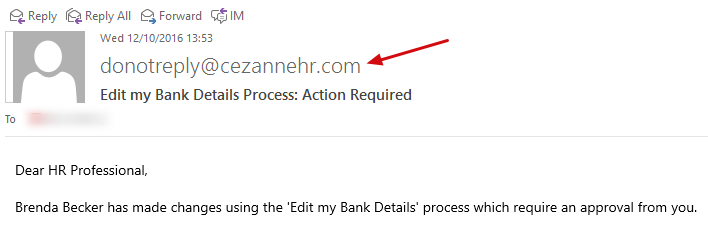 When a user receives the e-mail from Cezanne, it will normally be sent from "donotreply@cezannehr.com" or "donotreply@cezannehr.com on behalf of someone@mycompany.com".