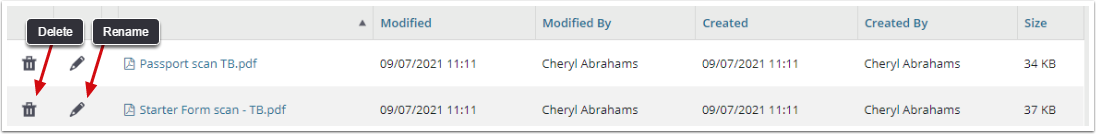 6. Any files uploaded will appear in the file window with information including the time and date of their creation and last modification, as well as the user who created or last modified them: