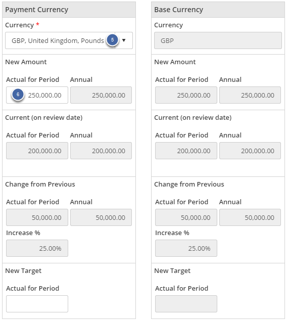 Depending on the data entered, the screen automatically pulls through the data from corresponding Compensation records and enables the user to enter New Amounts and New Targets.