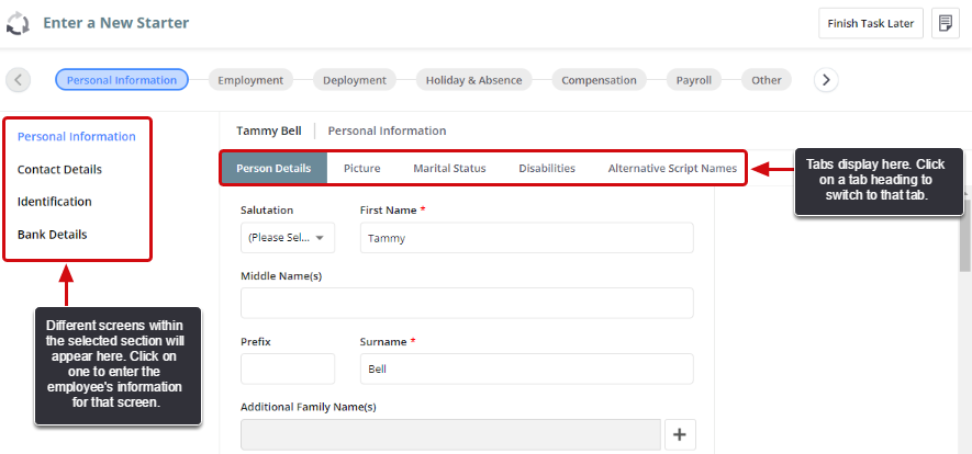- Then move on through the tabs: Picture, Marital Status, Disabilities, Alternative Script Names