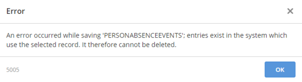 "An error occurred while saving 'PERSONABSENCEEVENTS'; entries exist in the system which use the selected record. It therefore cannot be deleted."