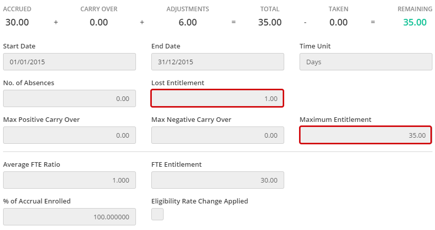 - Accrued Entitlement (30.00) + Adjustments (6.00) = 36.00 days