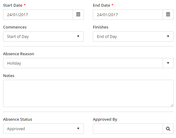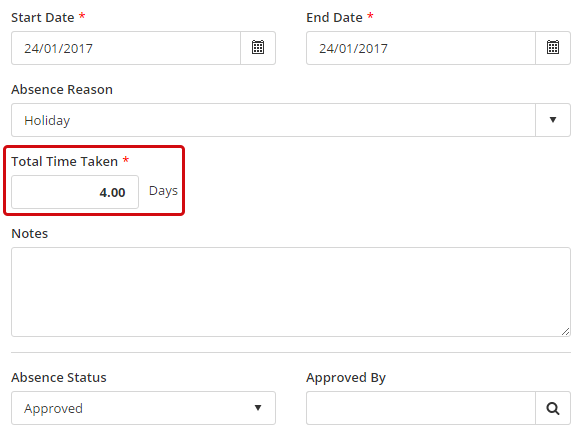 When this option is selected, time taken for an absence has to be entered in the Total Time Taken field manually on the Absence Event Details screen: