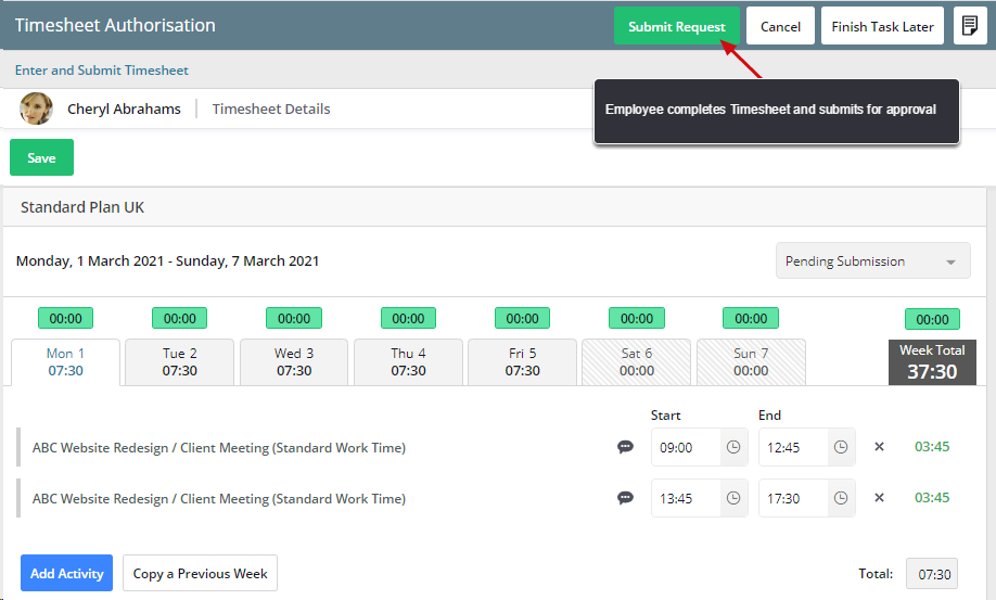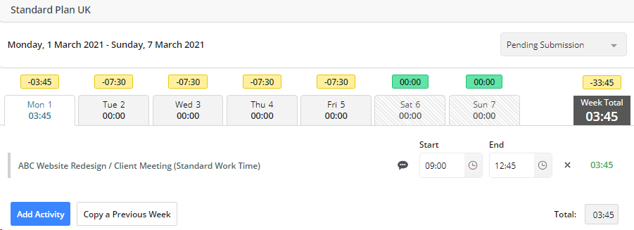 - A Timesheet must always start on a Monday. If you select a date that is not a Monday, the previous Monday will automatically be selected as the start date for that week.