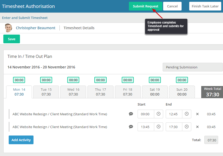 - Regardless of whether a Timesheet is automatically or manually created, an Employee can Unsubmit a submitted Timesheet, as long as it has not yet been signed off (or submitted to a further stage in the process) via their Timesheets screen.