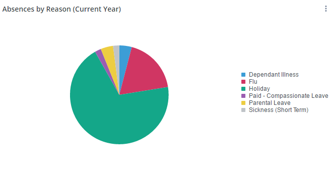 'Absences by Reason (Current Year)' Widget This widget contains a pie chart which displays the proportion of absences that have been taken for each absence reason in the current calendar year. Hover over each section of the pie chart to see the totals.