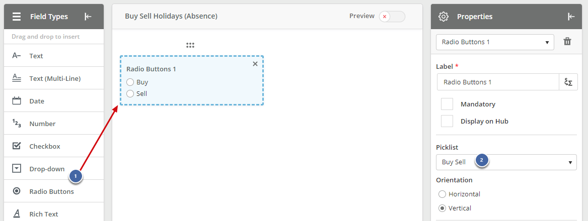 1. Drag and drop either a Drop-down, Autocomplete or Radio Buttons field on to the form.2. In the Properties, select your Picklist. (If you are using Radio Buttons, you can also select whether to display Horizontal or Vertical)
