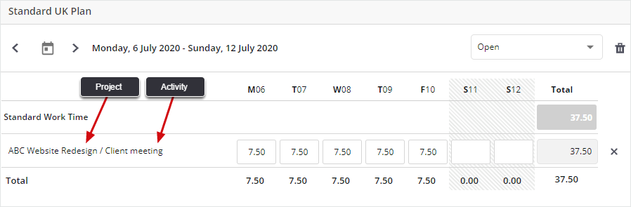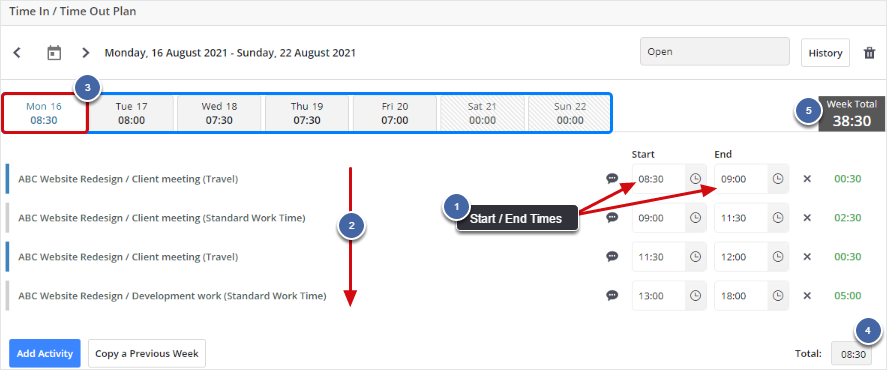 - Weekly totals are displayed for individual Activities and also for each Time Type.