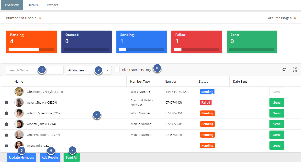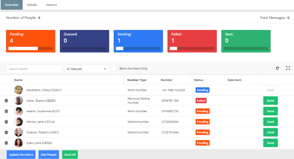 - If there are any duplicate numbers in the list, the message will be sent once when you press 'Send All'.