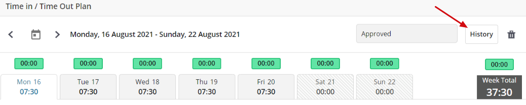- The timesheet will now be open, and the History screen will appear as below:
