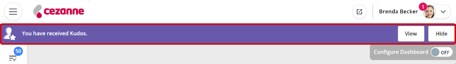 When a user has received Kudos, a banner notification will automatically be generated and appear the next time they log into Cezanne. The banner will continue to be displayed until the user clicks View or Hide.