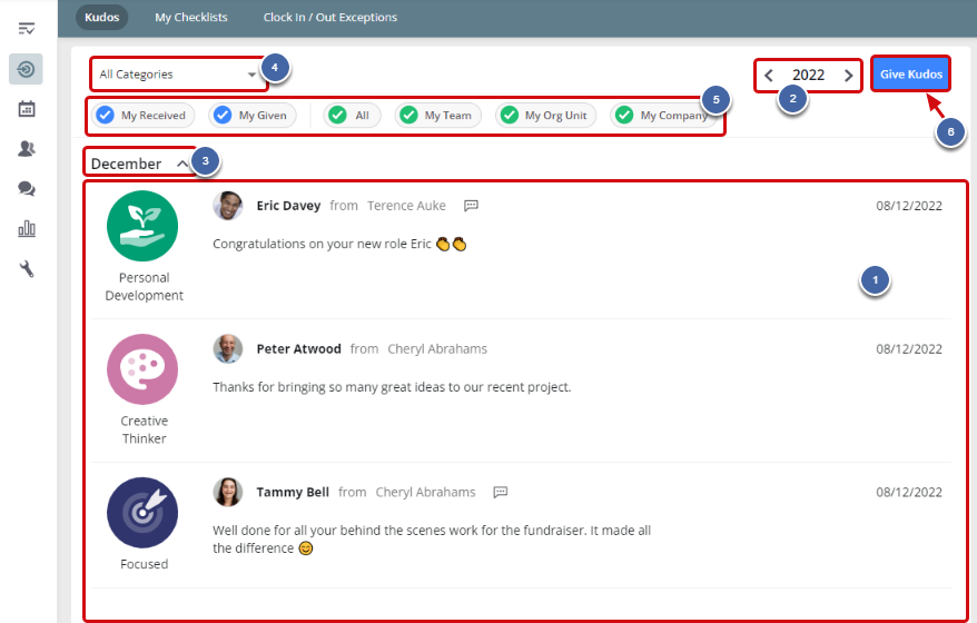 - The Kudos message and whether it has any comments (if a Kudos has comments a speech bubble icon will be displayed).